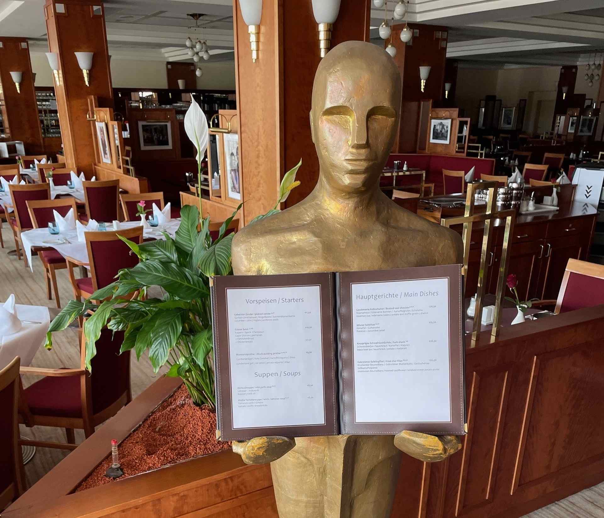 Zwischen originalen DEFA-Filmpostern und Hollywood-Szenen aus Babelsberg erwartet euch ein ganz besonderer Star: ein lebensgroßer Oscar mitten im Restaurant.